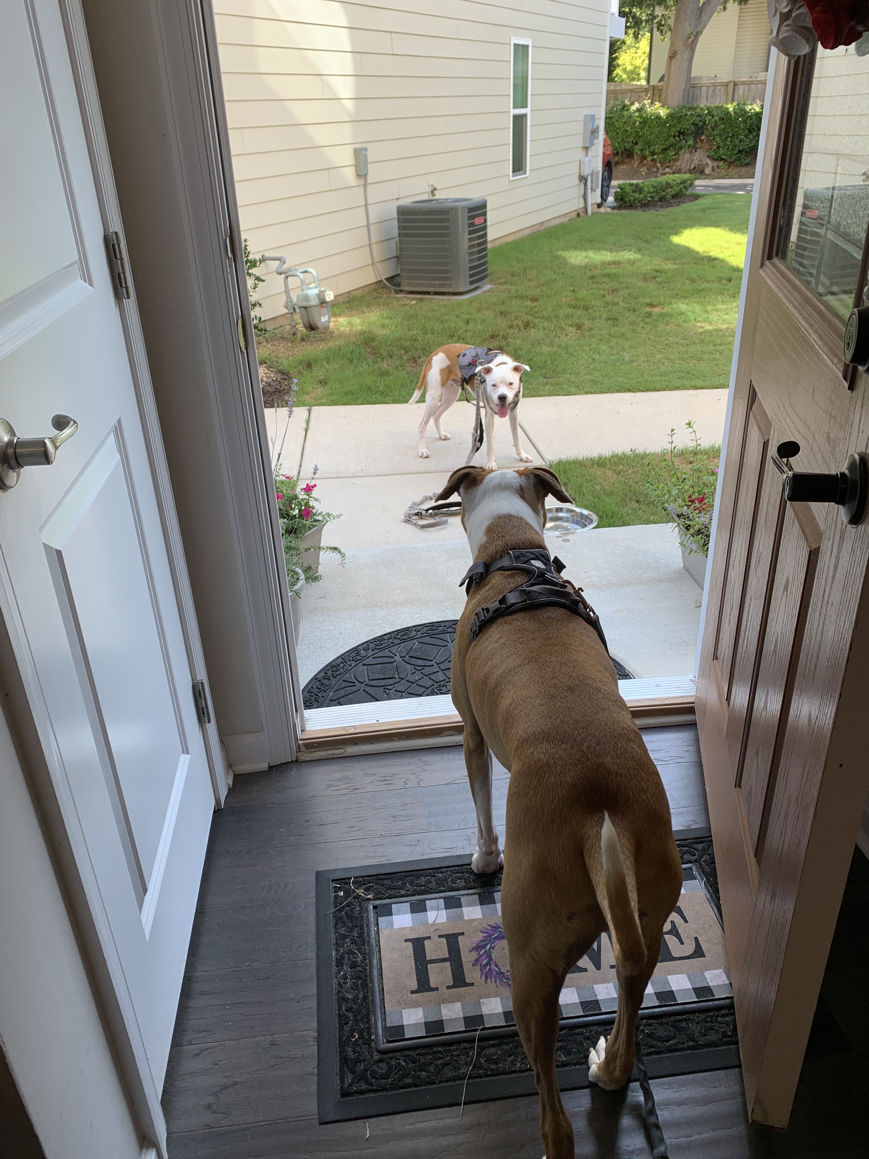 I’ve been playing with my friend, my bestie, Jetson. We play hard (Mom says), we chew each other’s neck skin, ears, mouth, legs, we run and play ‘catch me’ and take a break for about 30 seconds – 1 minute, panting a lot a lot, and then go at each other again. Sometimes, he’ll come to my door or I’ll go to his door and bark so we can get our humans to bring us out to play. We love eating grass together, chewing on sticks together, I mean my friend Jetson on one end and I on the other end. We make our humans laugh a lot. We also give each other kisses, especially when it’s time to go our separate ways…
