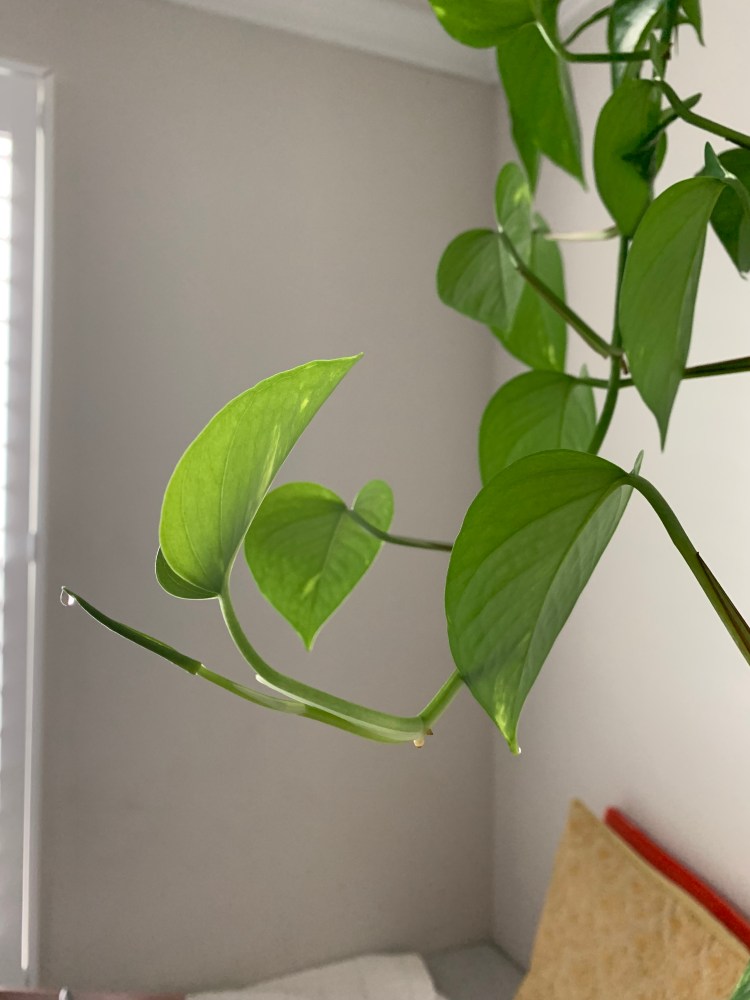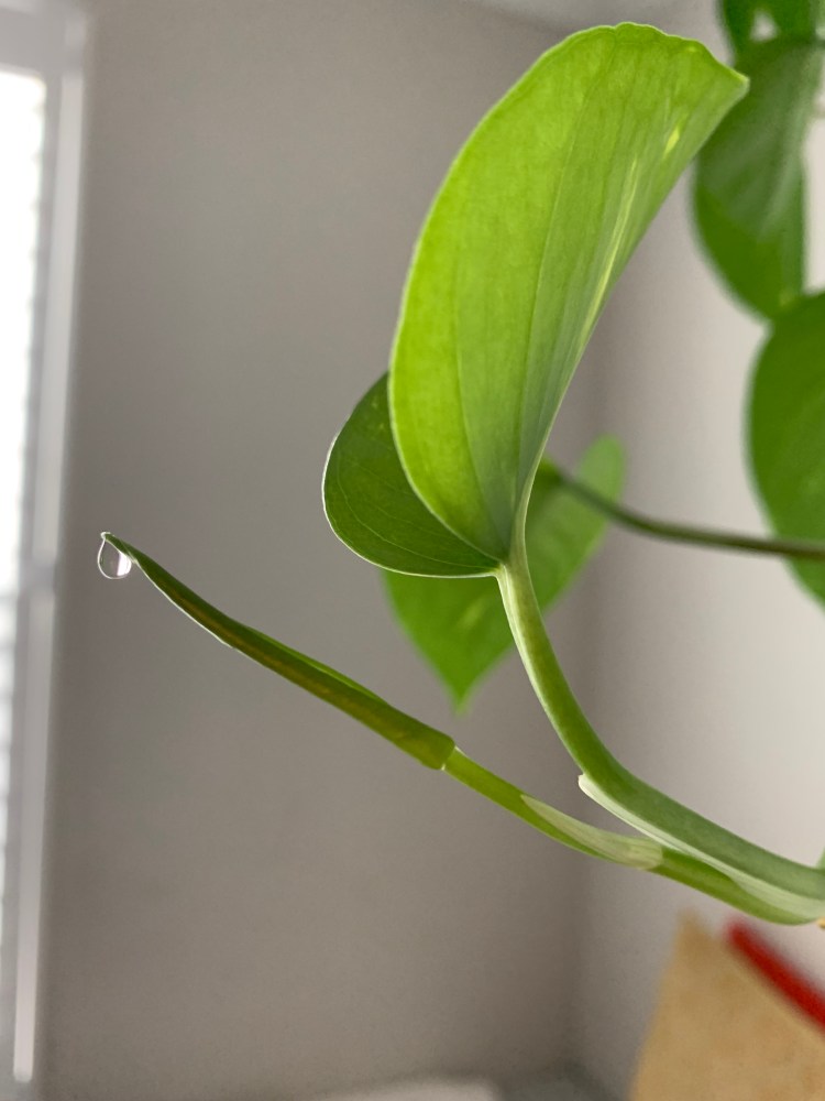 This is a plant hanging in my living room that expels these drops of water from the most distal leaf every morning. It has become a private joy for me each morning as I sit right under it drinking my coffee and being amazed by its formation.