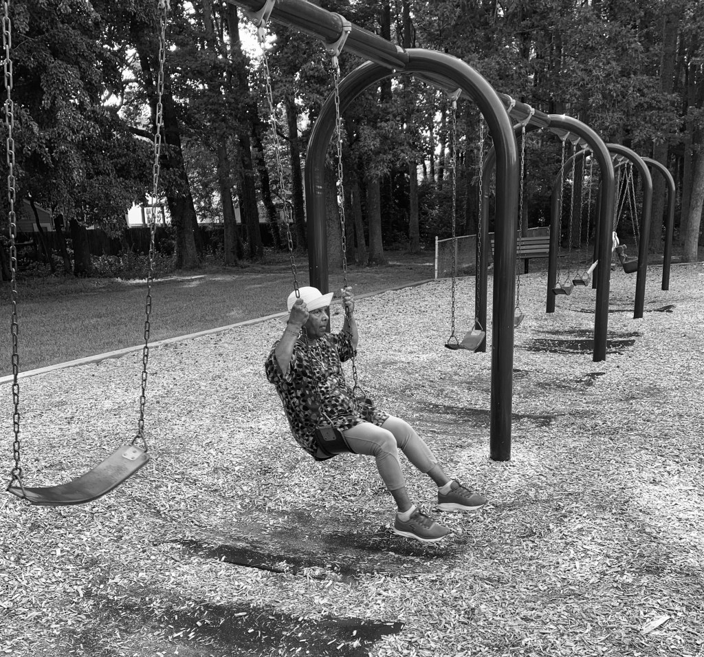 We spent many early mornings, before the heat became too unbearable, walking in several of our beautiful parks. It was fun watching Mom get on the swing above and become carried away with the back and forth motion that brings excitement and thrills to millions of kids of all ages. Bustey also had many opportunities to explore numerous terrains and never failed to take me off the beaten path to create new experiences for us.