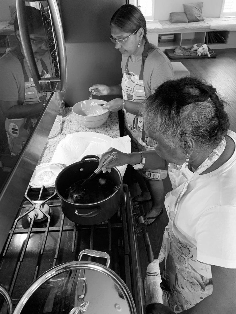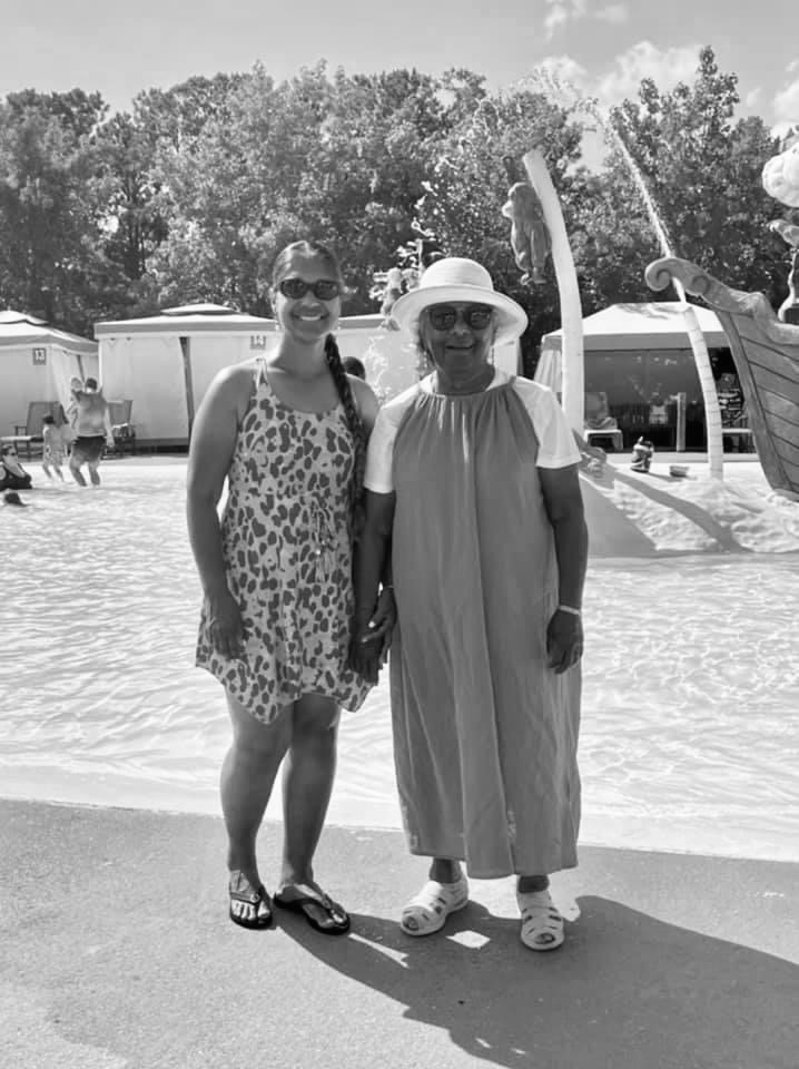 During one of our monthly family Zoom calls, my sister and Mom are pictured in my kitchen making phoulourie, an Indian appetizer, to enjoy during Mom’s sister’s 88th birthday celebration online. And, Mom made it to our nearby water park with my sister and her family in the center pic.